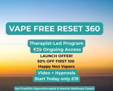 Vape Free Reset 360™ was created by Ian Franklin, Award-Winning Hypnotherapist & Mental Wellness Coach, after helping hundreds of people quit vaping successfully through his private practice.